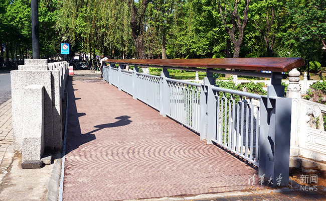 西门桥横跨于校河之上,是清华路的重要组成部分,也是西门通往学校的必经之桥。本次施工主要对西门桥进行了拓宽,在原有桥体两侧的石栏外铺设步行桥。步行桥建设工程于3月开工,4月26日正式完工。