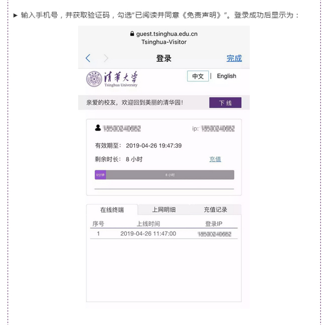a.下线时只需点击“下线”按钮即可。如30分钟内无流量,用户将自动下线,再次登录要再次获取短信验证码。