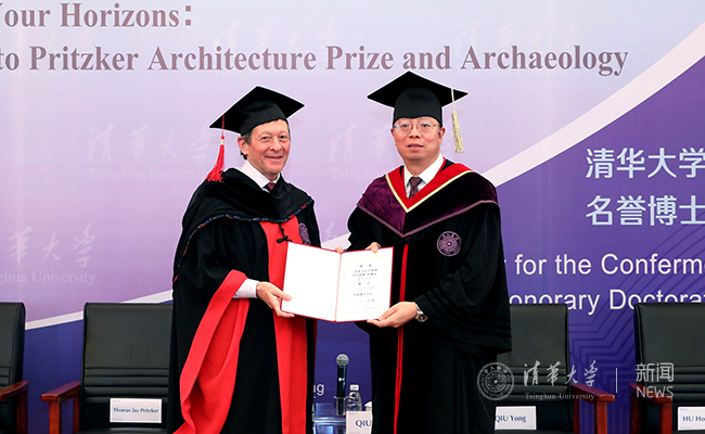 在授予仪式上,邱勇对普利兹克获得清华名誉博士学位表示祝贺。他表示,普利兹克先生不仅是商界、文化、国际事务及社会公益领域的杰出领军人物,在建筑领域也备受尊敬并深具影响力。在普利兹克先生的大力支持下,清华于2011年启动了普利兹克-乐动平台建筑英才培训项目,为中国青年建筑学子提供了跟随世界顶尖建筑大师学习和深造的机会。