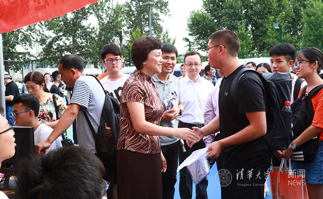 在数理类迎新点,陈旭向工作人员仔细询问新生报到情况以及大类招生后的相关工作,并对报到新生表示欢迎,鼓励他们在清华追逐自己的梦想。