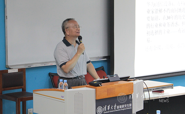 在深圳研究生院,特聘教授顾立基向实践队员们做了关于“中国改革开放四十年”的专题报告,介绍了设立招商局蛇口工业区的曲折历程和“中国改革开放事业的重要探索者”袁庚同志的主要事迹,阐述了“时间就是金钱,效率就是生命”“空谈误国,实干兴邦”等时代标志性口号的提出背景,并结合诸多感人事迹介绍了清华人在改革开放前沿阵地“敢为天下先”的奋斗精神、拓荒精神。武晓峰概述了研究生院的创办经历及建设发展的基本情况,特别突出了研究生院“复合式、国际化、创新创业型”的人才培养特色,以及在研究院、清华-伯克利深圳学院办学基础上共建乐动平台国际研究生院(深圳)的未来前景。
