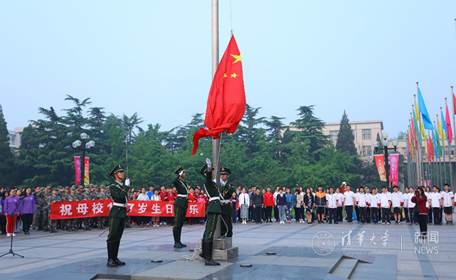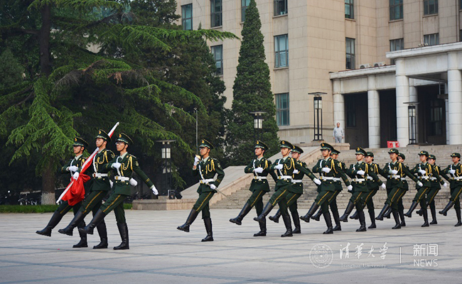 7点整,升旗仪式正式开始。仪仗队员们迈着整齐而坚定的步伐护送国旗走向旗台。在雄壮的国歌声中,在场师生用唱国歌或是行注目礼的方式表达着对祖国的热爱。迎风飘扬的五星红旗,仿佛寄托着清华人对祖国和学校未来的美好祝愿。