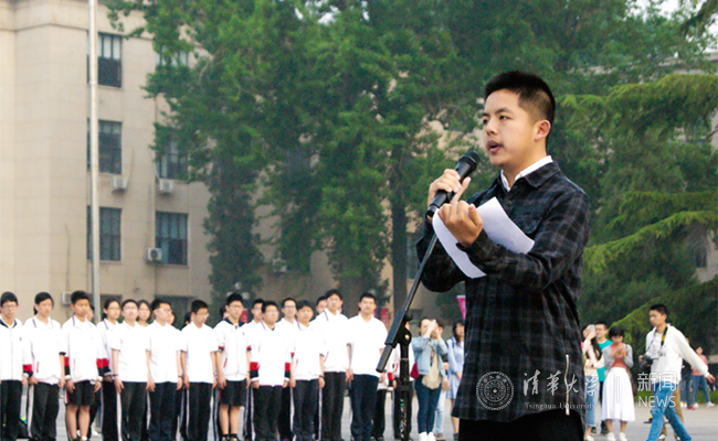 新雅书院潘宇昂同学作国旗下演讲。他在演讲中将清华与国家发展、民族进步紧密联系起来,他表示,如今国家发展进入新时期,中国特色社会主义进入新时代,清华也向着“更创新、更国际、更人文”的目标,向着建设世界一流大学迈步。他号召所有清华人应当有自己的担当,上大舞台,成大事业,又红又专,全面发展,以其会通,而求超胜。