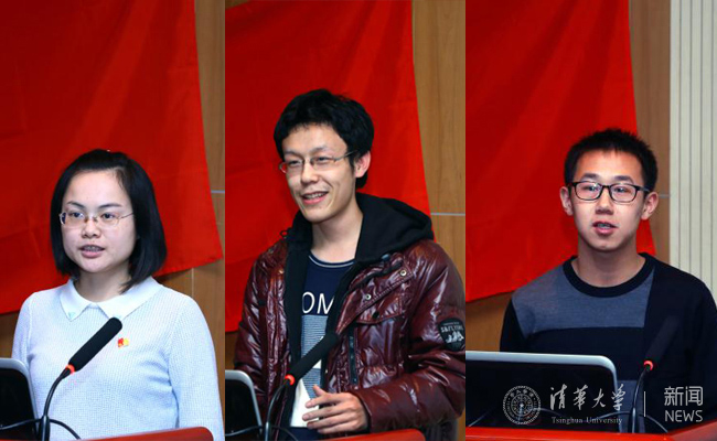 “微党课”环节学生党员发言,左起:周晓英、王涛、徐家璐。常志东 摄