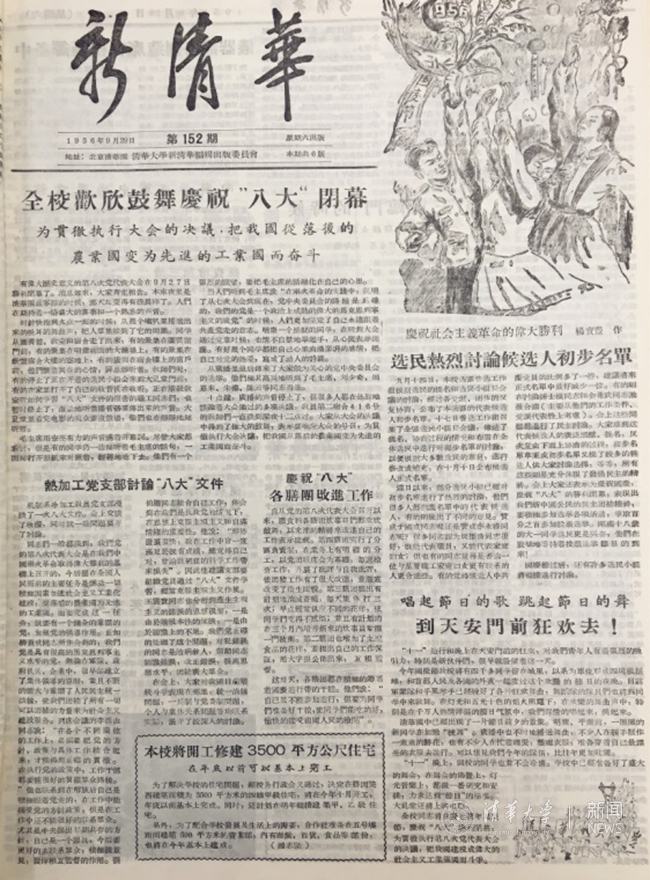 八大召开后,全校师生员工热情沸腾、热烈庆祝。据当时的《新清华》报道,每日早晨七点开始,校园内各扩音器和大礼堂的都广播八大消息,一大清早邮局旁就有人守候着当天的报纸。校党委及工会、青年团组织广大党员和全校人员认真学习“八大”会议文件和报告,各院系、部门、教研组纷纷举行组织生活、理论学习和座谈会等,交流心得体会。师生们表示要响应大会号召,为把我国从落后的农业国变成先进的工业国而奋斗。