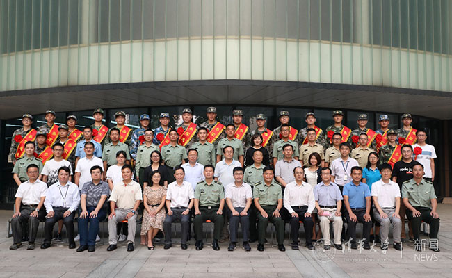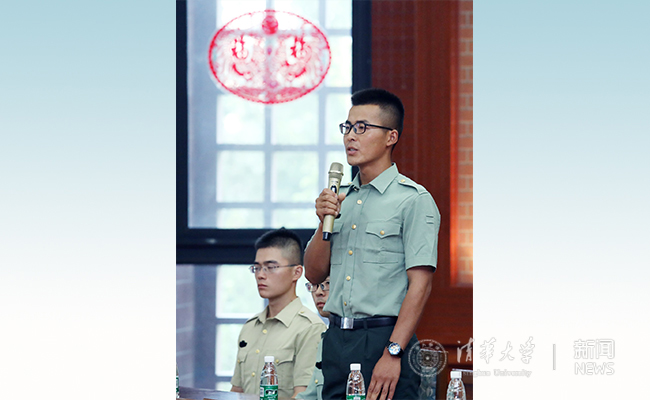 退伍老兵们也汇报了自己的军营收获。材料学院2014级本科生韩宝瑞曾参加在庆祝建军90周年阅兵,今年光荣退伍。他勉励新入伍同学,既要忘记自己是清华人,更要记住自己是清华人,在两年的军旅生涯中文明其精神、野蛮其体魄。