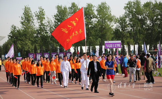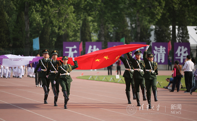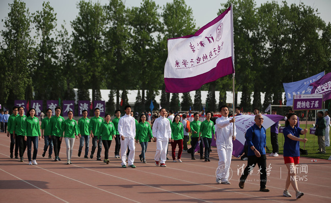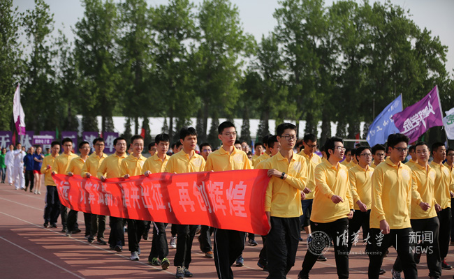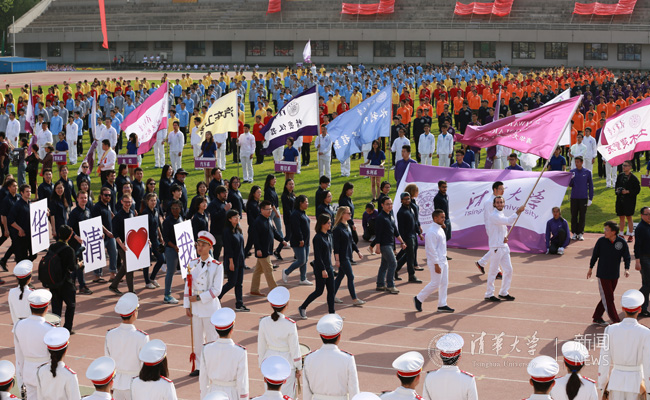8:00整,伴着军乐团激昂的乐声,国旗班成员、校旗方阵、“双60”方阵、裁判员方阵、体育协会方阵、各院系运动员方阵和校友代表方阵依次入场。主席台和看台上的观众全体起立,为各个方阵鼓掌加油。整齐的步伐、统一的着装、响亮的口号,还有展现院系特色的“吉祥物”,每一个方阵在引导员、旗手和领队老师的带领下,顺序走入赛场,走过看台,充分展现出清华学子积极向上、拼搏奋进的风采和精神。