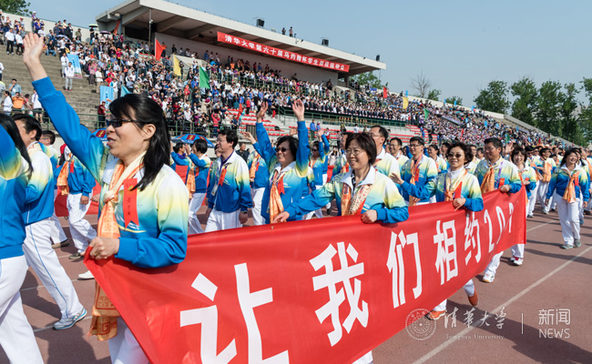 毕业20年的1997届校友组成亲子方阵,带着神采奕奕的“小清华”们回到母校。曾在国庆35周年庆典上正步走过天安门广场的1982级校友们,在去年国庆节发起为期202天的“大学毕业30年,一起跑回清华园”的活动,今天,当他们终于跑回清华,很多师生校友眼含热泪与他们共同表达对母校的感激与热爱。最后,当102位毕业50年的1967届老校友们身着红黄渐变的运动服举起“祖国健康工作50年,快乐生活每一天!”的横幅走过主席台时,全场起立,用雷鸣般的掌声向他们毕生践行母校的期望致敬。