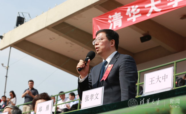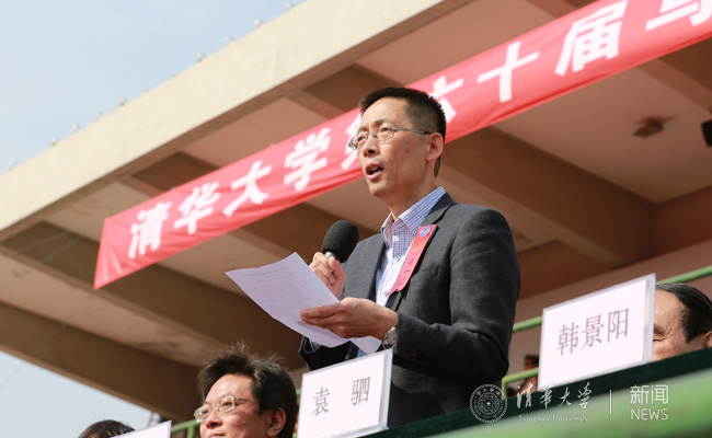 入场式后,副校长施一公致开幕词。施一公说,1957年蒋南翔在全校体育干部会上提出的“为祖国健康工作五十年”的口号,60年来伴随并激励了每一个清华人。今天我们将迎来第60届“马约翰杯”学生田径运动会和“为祖国健康工作五十年”口号提出60周年。经过60多年发展,清华学生运动会从最初单一的田径运动会发展为贯穿全年、包含40多个赛事的综合性的“马约翰杯”课外竞赛体系。在浓厚的体育氛围下形成的“育人至上、体魄与人格并重”的体育教育观,培养了一批又一批全面发展的优秀人才。“无体育,不清华!”的结语引起现场强烈共鸣和掌声。