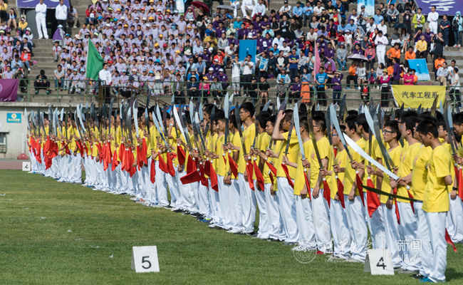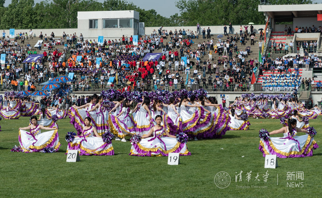384名手持花球的女生首先上场,带来了热情四射的啦啦操表演。同样由384名大一男生表演的刀术展示了清华力量、宣扬了清华精神,整齐划一的动作展示了刻苦训练的成果,嘹亮高昂的口号喊出了拼搏向上的精神。两场团体操的表演同时,健美操专项课的女生和清华附中及清华附小的同学们也带来了精彩表演。