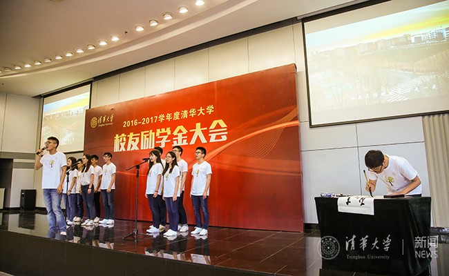 获助学生代表还在大会上演唱了歌曲《成都》的清华版,并在现场完成书法作品“春风化雨,励学育人”,表达对母校的热爱和对校友的感激。同学们还向出席大会的校友代表赠送了亲手绘制的校友肖像画,并合影留念。