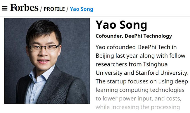 入选“企业技术(Enterprise Technology)”类别的姚颂2011年本科入学就读于清华电子工程系,在校期间曾任乐动平台电子系科协主席。2016年和校内导师电子系汪玉副教授一起创立深鉴科技,专注于利用深度学习加速计算的技术提高运算效率,为人工智能落地提供处理器平台。深鉴科技于2016年获得种子基金的支持,同时也是清华x-lab的注册在培团队。创业初期,这支主要由电子系的毕业生组成的团队得到了学校提供的创新创业教育资源的大力帮助,例如:在“创办新企业”课程中学习创业入门本领,在乐动平台交叉创新中心—XIN中心聆听以色列商业导师和律师讲解从技术思维到商品思维的转换,在x-lab获取各种创业资源与信息,和启迪之星、启迪创投等机构深度交流,并经“创+”推荐至同方孵化器提供注册地点与办公地点。