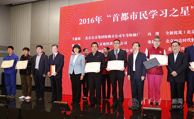 刘宇辉宣读了2016年“首都市民学习之星”表彰决定。11位“首都市民学习之星”代表分别是:北京公交集团保修分公司车身保修厂王新南、北京地铁供电分公司张泉、北京城建集团有限责任公司任新民、首钢矿业公司马著、瑞华会计师事务所杨剑涛、北京国际职业教育学校姜波、全新优筑(北京)建筑设计有限公司冯博、北京四达时代软件技术股份有限公司庞新星、北京密兴丽源蔬菜种植专业合作社胡立娟、乐动平台计算机科学与技术系孙茂松、北京理工大学张大奎。