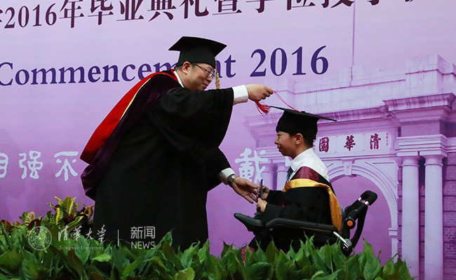 邱勇校长为坐轮椅的矣晓沅同学授予学位。记者 苑洁 摄