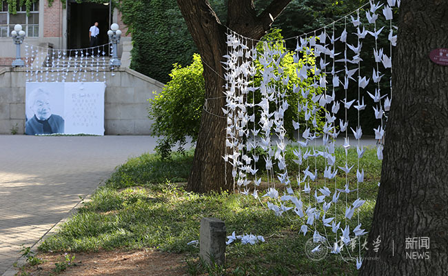 5月26日,清华学生自发折了一千只纸鹤纪念杨绛先生,此为老图书馆前的“千纸鹤”。学生记者 杨东 摄