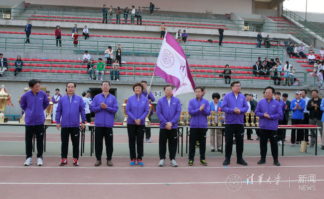 闭幕式开始前,校领导邱勇、陈旭、史宗恺、姜胜耀、吉俊民、李一兵、尤政,校长助理王希勤等身着统一的紫色运动服,在刚刚结束比赛的跑道上列队待发。他们用带队跑步绕场一周的方式,身体力行地践行清华体育精神,传递着体育育人的学校传统。这也是“马杯”田径运动会闭幕式上首次采用这种方式入场。