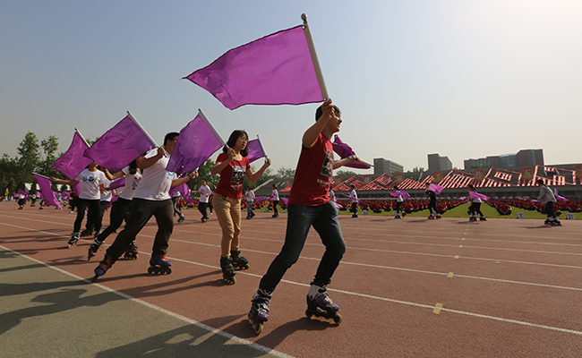 精彩的团体操表演是今年“马杯”开幕式的一大亮点。男生的“清华拳”、女生的啦啦操,生动展示了2000多名大一学生日常体育课的教学成果。1152名身着红色上衣的大一男生从东大操场的东边跑上草坪,操场瞬间变成一片红色的海洋。“清华拳”展示了清华力量、宣扬了清华精神,整齐划一的动作展示了刻苦训练的成果,嘹亮高昂的口号彰显了拼搏向上的精神。身着黄色上衣的旗手们挥舞着各院系的旗帜,自东向西奔跑,引起看台上的阵阵欢呼。