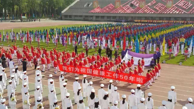 第一场团体操结束后,864名手持花球的女生上场,带来了热情四射的啦啦操表演。