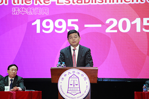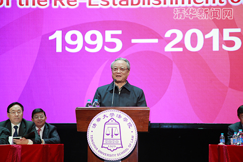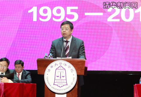 邱勇在致辞中代表学校向莅临的各位领导和嘉宾表示热烈祝贺,向法学院全体师生员工表示诚挚的祝贺。邱勇回顾了清华法学教育86年的历史,以及从中走出的灿若繁星的法学大家和杰出人才。他指出,清华法学院复建20年来始终立足中国特色社会主义法学理论的实践与创新,积极参与国家法治建设各个环节,主动承担依法治国的社会责任;始终坚持以人才培养为根本,以培养中国特色社会主义法治国家的建设者为己任,着力培养学生的责任担当;始终高度重视教育教学,逐步建立起了一支优秀的师资队伍,并自2011年至2015年连续5年获评QS全球法学院50强。经过20年的发展,如今一大批清华法学院毕业生活跃在法学学术研究、立法、执法、司法和法律服务领域,为我国法治建设作出了重要贡献。