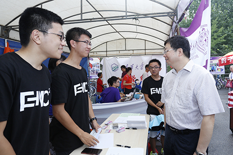 在综合体育馆西侧的网球场院系迎新区,邱勇先后来到经管学院、人文学院、国防定向生、机械工程系、物理系、化学系等各院系迎新点,与迎新工作人员和办理手续的新生亲切交流。