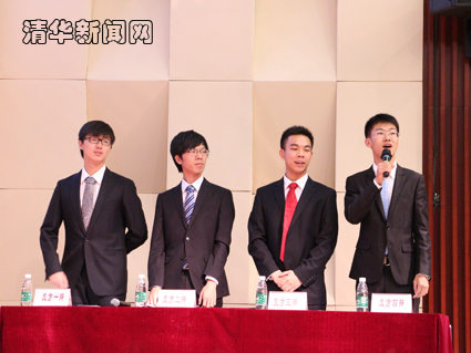 图为乙组决赛反方电子系一队,从左到右依次为:一辩张霁恺、二辩陈贺振、三辩李潇翔、四辩王治博。冉展 摄