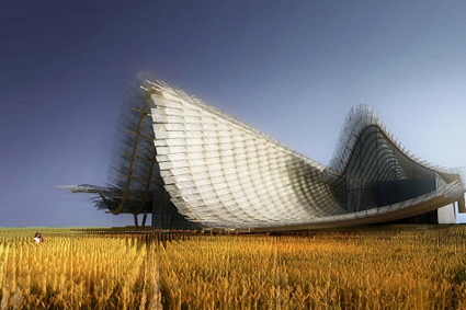 中国国家馆将以“希望的田野,生命的源泉”为主题,以4590平米的第二大外国自建馆精彩亮相意大利米兰世博会。这是中国第一次以独立自建馆的形式参加在海外的世博会,也是中国第一次通过独立设计全面展示国家形象。中国国家馆设计方案以“天、地、人、和”为核心概念贯穿设计。建筑从正面看是自然的天际线,从背面看是城市的天际线。建筑方案通过建筑的屋顶、地面和空间,将“天、地、人”的概念和水稻、小麦的元素融入其中,如同希望田野上的一片“麦浪”。 “希望的田野”中意喻中国广袤的土地,隐喻中国古老的文明。展馆充分吸收中国传统建筑的结构和形态,结合现代技术,形成具有强烈中国传统建筑意向的中国馆形象。屋顶采用具有中国象征意义的竹编材料覆盖,大幅度降低了材料成本。在意大利灿烂阳光的照射下,将折射出金色的光芒。