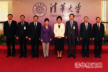 演讲前,刘延东、陈吉宁、胡和平等与朴槿惠总统在三楼会议室进行了简短会晤,并在清华校训“自强不息、厚德载物”背板前合影留念。