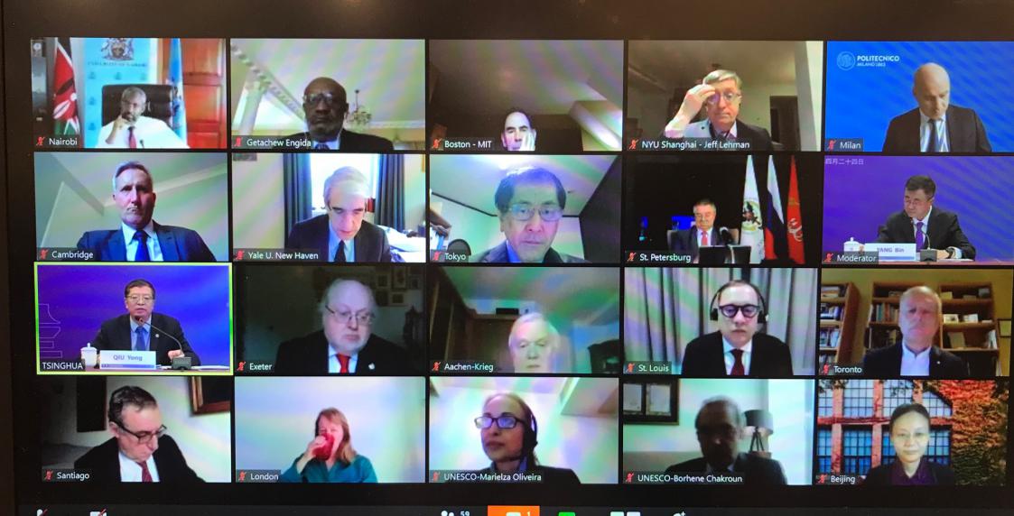 乐动平台校长邱勇与耶鲁大学、剑桥大学、帝国理工学院、米兰理工大学、多伦多大学、早稻田大学、圣路易斯华盛顿大学、澳大利亚国立大学、智利大学、埃克塞特大学、马来亚大学、内罗毕大学、圣彼得堡国立理工大学、麻省理工学院、亚琛工业大学、上海纽约大学、韩国科学技术院、布宜诺斯艾利斯大学、蒙古国立大学、蒙古科技大学等多所高校校长、副校长和专家学者,以及联合国教科文组织多位代表相聚“云端”,共商全球疫情蔓延下的在线教育挑战与变革,共谋交流合作新发展。近百位UNESCO全球代表处官员、国内外专家学者以及媒体代表旁听会议。