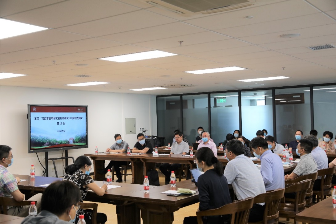 出土文献中心教师代表、教务处党支部全体成员、文科建设处工作人员共计50余人参加座谈会。会前,出土文献中心组织参会人员参观了清华简。