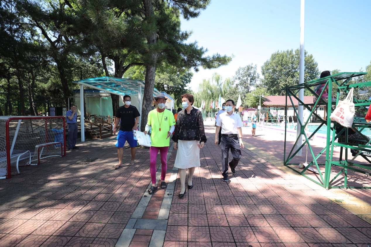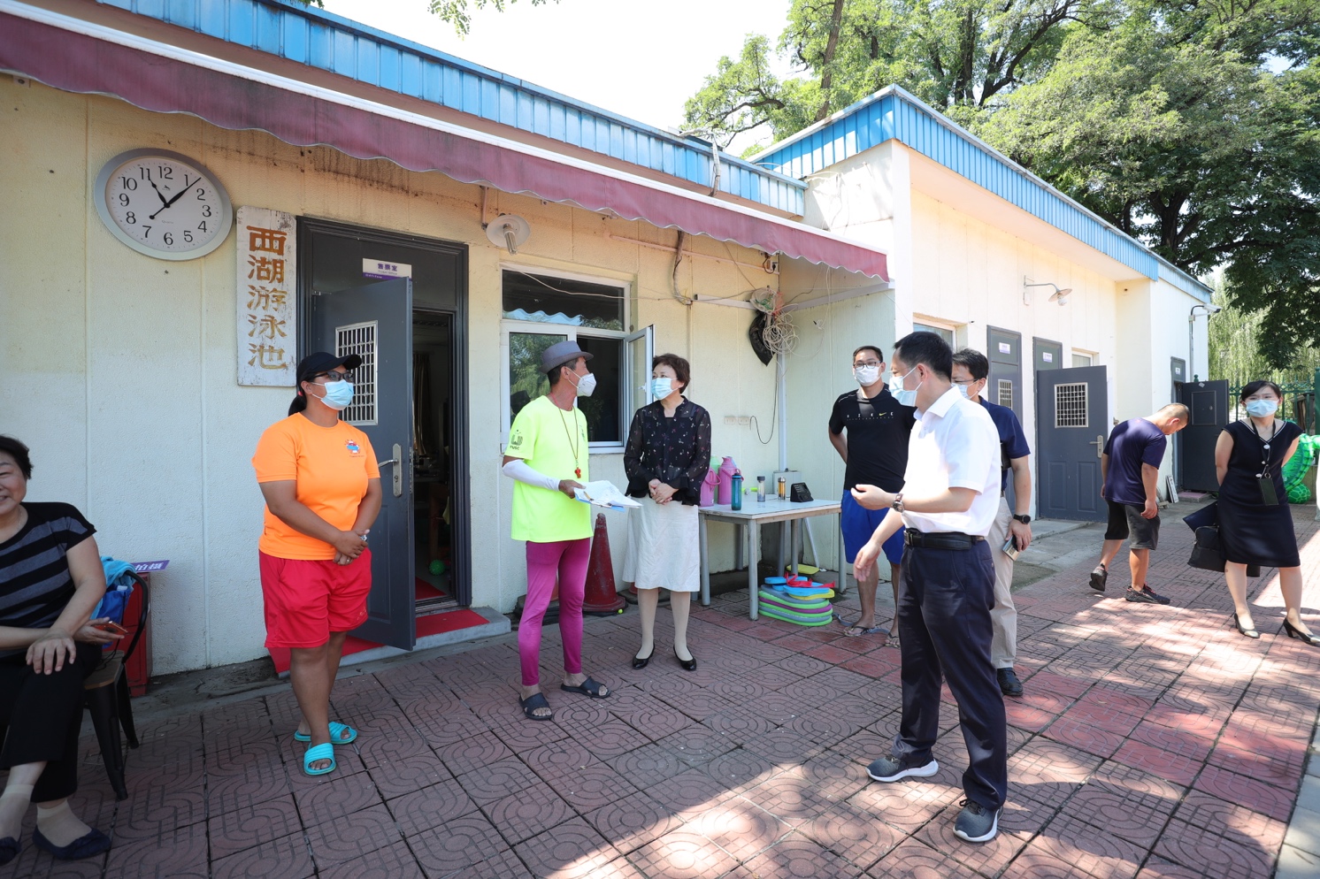 随后,陈旭一行来到西湖游泳池,察看游泳池开放情况和为清华园社区师生员工、居民服务情况,详细了解防疫措施、预约机制。陈旭指出,西湖游泳池是师生员工的夏季重要活动场所,工作人员要继续加强管理,做好值班值守工作,落实疫情防控各项要求,做好消杀、人员流控和安全管理。
