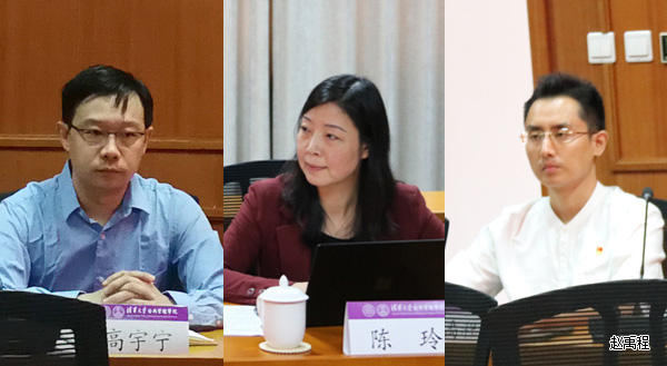 教师代表高宇宁(左一)、陈玲(左二)、赵禹程(右一)交流发言