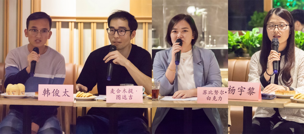 参加座谈会的新生畅所欲言(从左至右分别为韩俊太、麦合木提·图达吉、苏比努尔·白克力、杨宇黎)