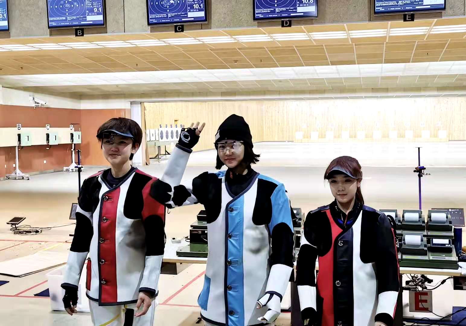 杨倩(左一)获得女子10米气步枪个人亚军、团体冠军