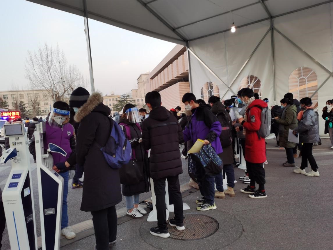 进校过程严格高效。研招办协同校内各考场教室及相关部门,密切配合、充分沟通、协调,模拟演练到位,针对疫情防控为考生入场环节增加的流程,研招办联合保卫处、研工部并组织学生志愿者,提前对考生入场情况进行了模拟演练,对入校信息核验流程进行视频录制和发布,增加导引信息、路线标志、扩音设备语音提示、短信提示等形式,在做好考生身份核验和健康核验的同时,保障在寒冷天气下考生进入考场的效率。校园摆渡车共发车90余次,接驳考生2000余人次,保证考生入场畅通有序。对个别晚到的考生,通过巡逻车直接送到考场教室,尽最大的努力帮助考生参加考试。