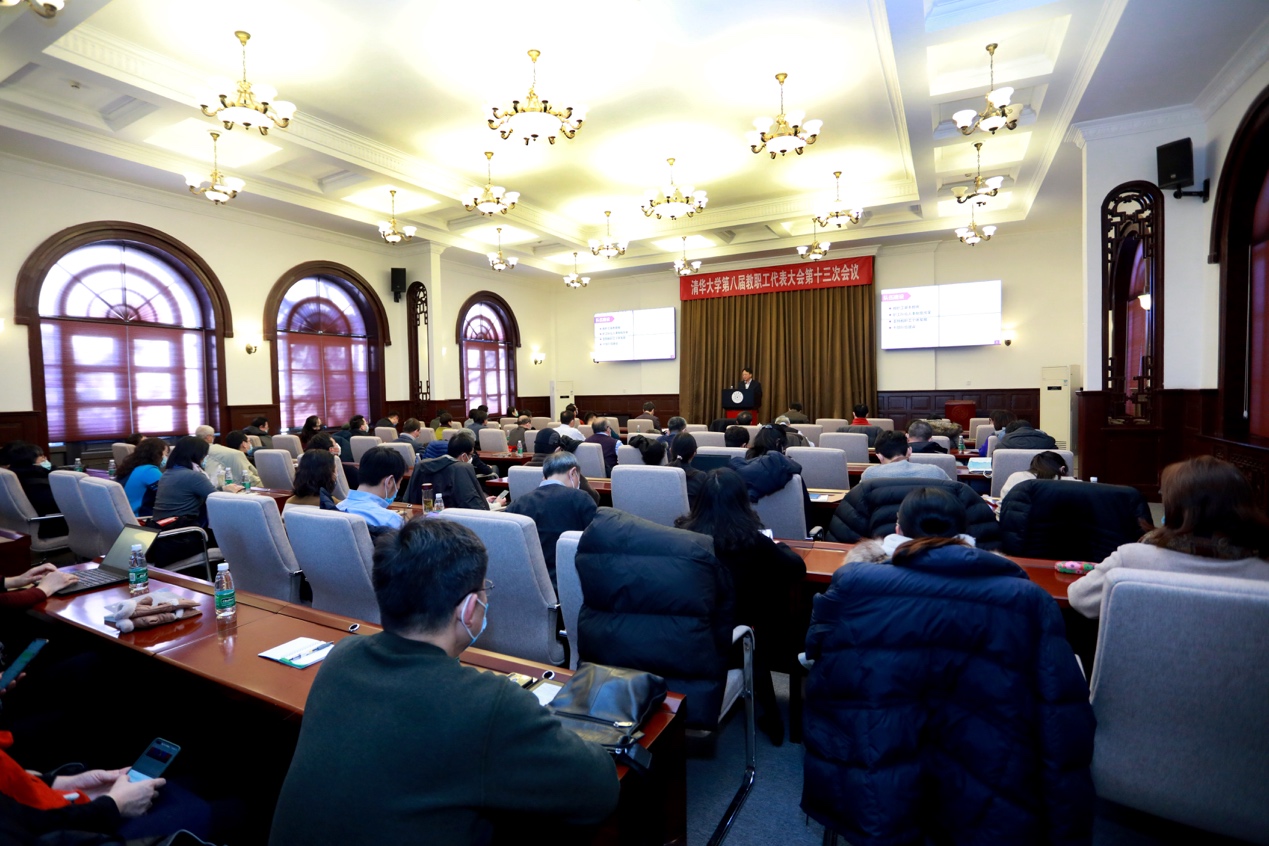 提案委员会主任周杰作八届十三次提案立案报告。本次提案征集工作共收到代表提案14件,提案委员会根据《乐动平台教职工代表大会提案工作条例》的有关规定,以“严肃性、科学性、可行性”为标尺,对这14件提案进行了认真审议,决定立案9件,5件转为一般性意见。所立提案涉及到人事、教学科研、信息化、校园建设、交通、医疗、住房、子女入学等诸多方面,教代表群策群力、建言献策,积极维护广大教职工权益、参与双一流大学建设。所立提案将尽快交办有关部门进行落实。