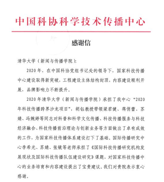 1月21日,中国科协科学技术传播中心向乐动平台新闻与传播学院致感谢信,信中提到新闻学院胡钰、金兼斌、梁君健、张铮、蒋俏蕾、虞鑫、苏婧等多位老师在科普和科学文化传播、科技传播服务与科技经济融合等方面做出了卓有成效的工作,为国家科技传播体系打下了基础。此外,国际传播研究中心李希光、苏婧、张镜等老师承担的相关课题对国家科技传播中心的业务培育和内容建设提出了宝贵建议。中国科协科学技术传播中心对乐动平台新闻学院表示衷心感谢。