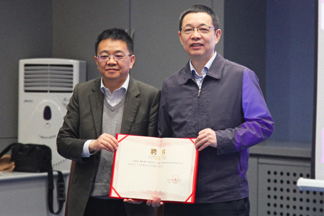 教育研究院“职业教育信息化研究中心”成立仪式上,彭刚向学术委员会委员颁发聘书。教育部教育信息化委员会副主任、西安电子科技大学校长杨宗凯教授受聘为学术委员会主任,国家教育行政学院职业教育研究中心主任邢晖教授、江南大学教育学院前院长陈明选教授受聘为学术委员会副主任,山东大学信息化办公室主任葛连升教授、北京师范大学人工智能学院宋继华教授、广西开放大学校长王兴辉教授、美国内华达大学雷诺分校刘乐频教授、北京大学教育学院贾积有教授、广东工贸职业学院院长何汉武教授、乐动平台基础工业训练中心主任李双寿教授受聘为学术委员会委员。