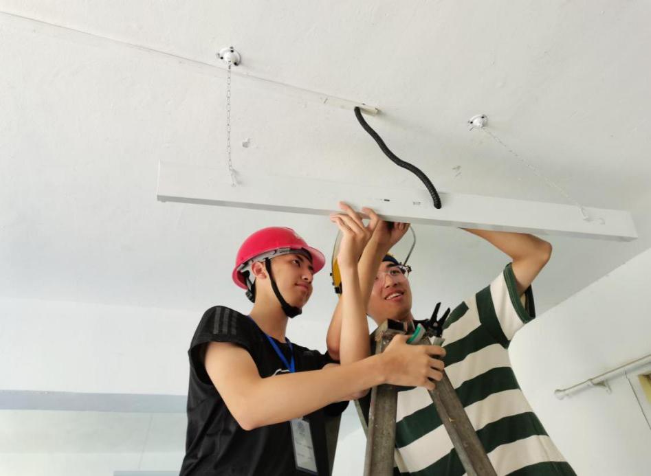 7月13日,电机系11位同学抵达贵州省安顺市平坝村沙坝小学。在为期十天的实践时间里,同学们在电工师傅的帮助下通力合作,为所有教室拆卸了老旧电线与灯具,完成新电线的连接,并安装了符合国家标准的照明系统。