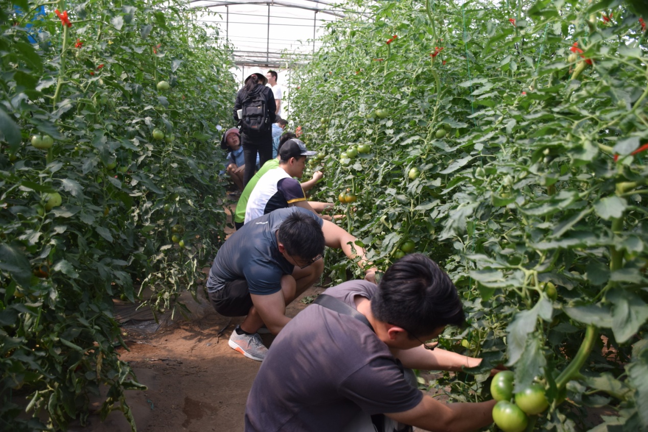 这次的实践任务,是帮助农户解决番茄打叶的问题。“过去认为这些蔬果种下地,浇水打药就可以高枕无忧了,现在发现并非如此。”大多数的实践队员和王竞弘一样,还停留在对传统农业劳作的认识里。而这一次,他们接触到的是精细化农业技术。与传统农业不同的是,精细化农业对温度、湿度、施肥量都有严格地控制。队员们分成小组,在行间劳动,帮农户采摘成熟的番茄和黄瓜,解决园区里采摘人手不够的问题。