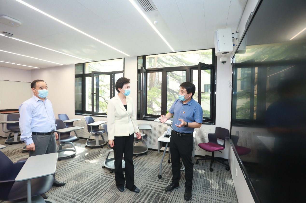 随后,陈旭一行又来到本学期刚刚投入使用的第三教室楼。陈旭仔细检查了测温登记、消毒通风等疫情防控措施执行情况,仔细了解公共学习空间里学生自习情况,逐一查看楼内不同类型教室的授课听课情况,检查新媒体教学设备的使用情况。在小组公共讨论空间,陈旭和正在进行课业讨论的学生交流,询问新教室的使用感受。