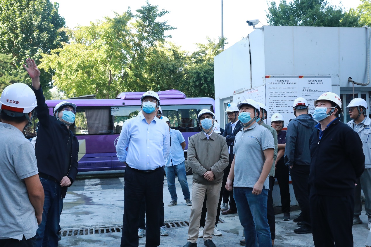 9月29日,尤政一行首先来到检查第一站——电子系。尤政向电子系相关负责人详细了解了罗姆楼外墙的施工进展、安全防护、后期维护、经费保障等情况,就恶劣天气的施工状况进行了深入交流。随后,尤政与在场工人亲切交谈,并叮嘱假期注意施工安全。