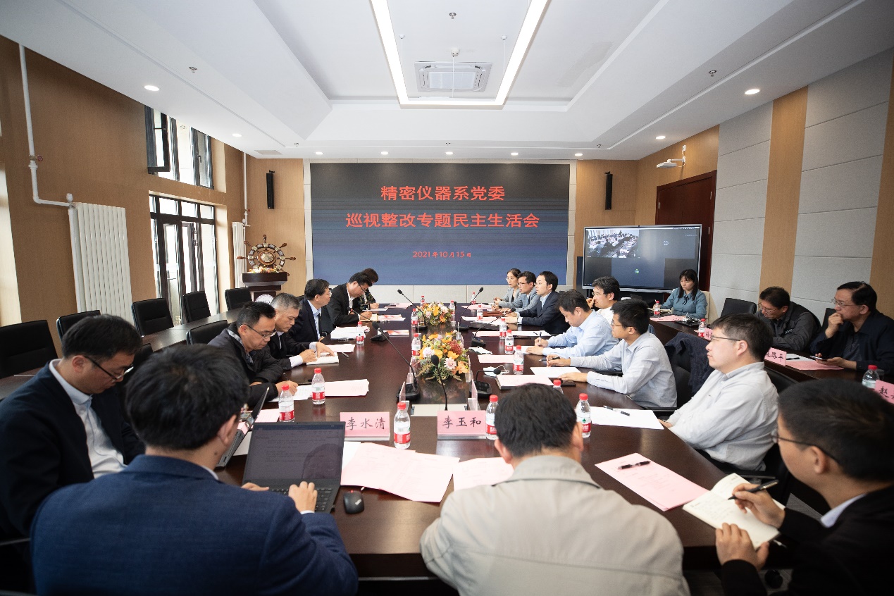 精仪系党委副书记吴冠豪代表党委汇报了精仪系党委落实巡视整改对照检查情况。对照中央巡视反馈意见和学校党委巡视整改方案,精仪系党委从贯彻落实习近平总书记关于教育的重要讲话精神、“卡脖子”关键核心技术攻关、落实立德树人根本任务、师德师风建设、基层党建等方面查找出八项问题和不足,并制定了整改方案、整改期限和责任人。