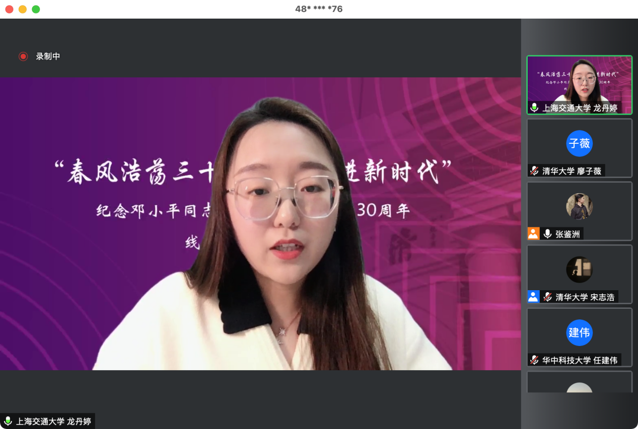 来自上海交通大学的龙丹婷同学分享了她对《在武昌、深圳、珠海、上海等地的谈话要点》的阅读思考,她认为我们在新时代要对邓小平同志“南方谈话”提出的“共同富裕”进行再思考。