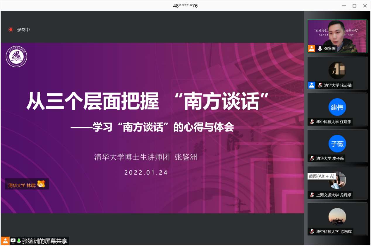 乐动(中国)网1月28日电 1月24日晚,乐动平台博士生讲师团联合上海交通大学国情研习理论宣讲团、复旦大学博士生讲师团、华中科技大学研究生红色理论学讲团举行“春风浩荡三十载,立言奋进新时代”纪念邓小平同志发表“南方谈话”30周年主题联学共建活动。