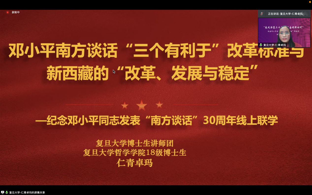 来自复旦大学的仁青卓玛同学以“邓小平‘南方谈话’三个有利于改革标准与新西藏的‘改革、发展与稳定’”为题,阐述了中国共产党领导的改革开放所坚持的“三个有利于”改革标准及“改革”实践观背后所蕴藏着的马克思主义唯物史观的哲学内涵。