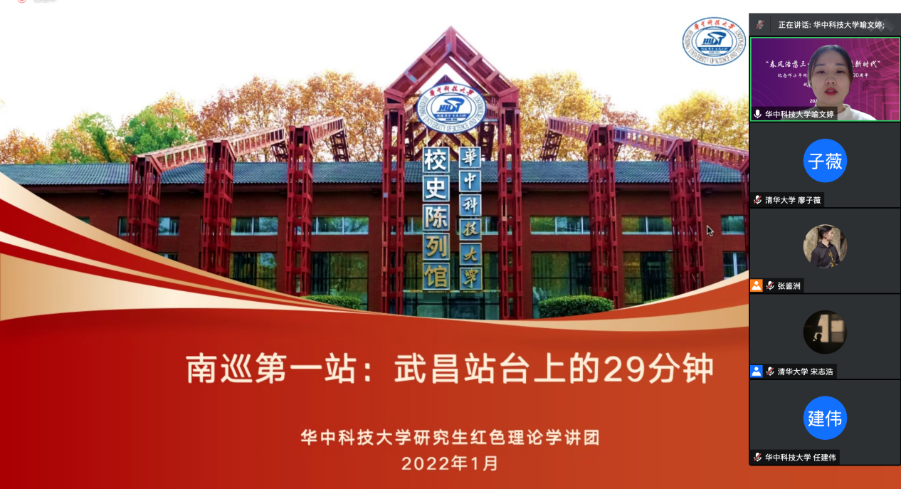 来自华中科技大学的喻文婷同学以“南巡第一站:武昌站台上的29分钟”为题,指出在新时代要以史为鉴,继续坚持和贯彻好邓小平同志在武昌考察时提出的重要论断。