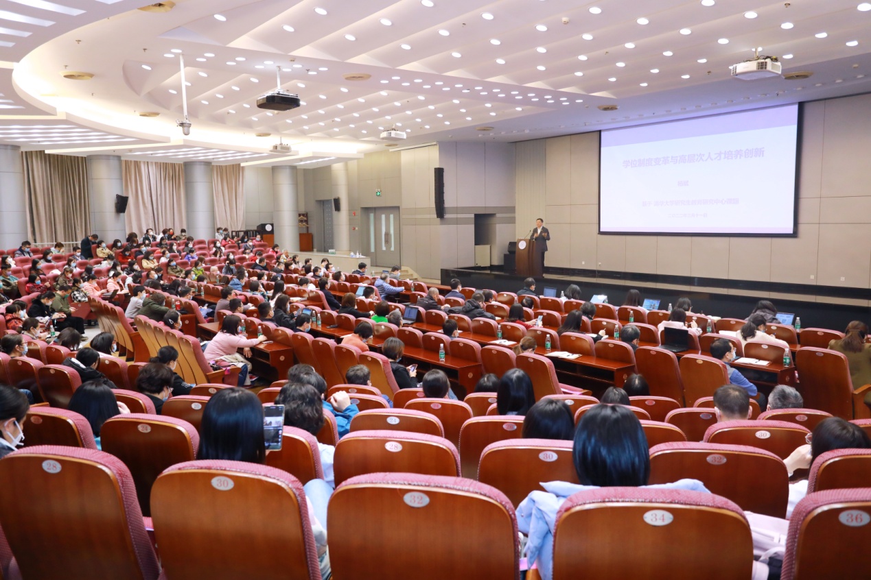 杨斌首先带大家回顾了近千年来各国学位制度的变迁,特别是1940年代后学位与研究生教育的加速发展。随后,杨斌重点阐释了中国学位制度与研究生教育的历程。多年来,中国研究生教育不断探索适合我国的研究生教育发展之路,由小变大,正逐步成为研究生教育强国。2021年中国在学研究生总人数达到333万,研究生已成为我国科技创新的中坚力量。站在新发展阶段,中国研究生教育已建立“四梁八柱”的制度体系,培养了大批党和国家急需的德才兼备高层次人才,成为支撑中国速度的智慧引擎。但不能忽视的是,研究生教育仍面临发展规模不充分不平衡、服务需求不足、培养质量有待进一步提升等问题。