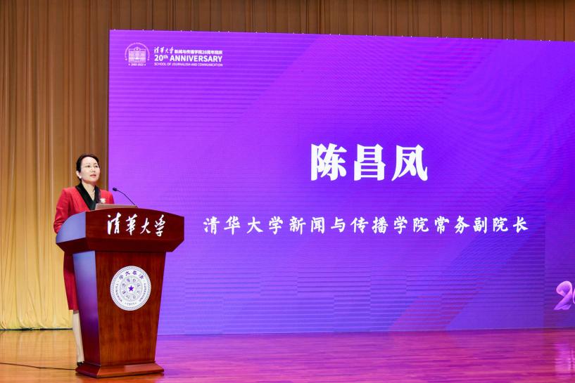 新闻与传播学院常务副院长陈昌凤代表学院总结了二十周年发展历程,向学院的创建者胡显章、孙宝寅、刘建明、王健华、熊澄宇、李希光、尹红和校内外几代建设者致敬,向院友和同学们表达了学院的问候,并深切缅怀范敬宜院长、徐葆耕教授。她表示,经过二十年的打磨,新闻与传播学院逐渐凝练成两大学科脉络,五个学术集群,形成了两大人才培养特色。清新的发展脉络之一是建设中国特色的新闻传播教育学科,建设中国特色新闻与传播理论体系,教育教学体系和学术共同体;另一个发展脉络是基于乐动平台学殖深厚、学科交融的传统,将科学技术应用于新闻传播学,形成清新特色的科学应用传播研究,培养文理兼备的复合型人才,这个脉络既适应世界发展的潮流,也符合国家发展的战略。
