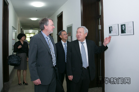 顾秉林向Ernst Rank教授讲解高等研究院的情况。记者 张 宇 摄