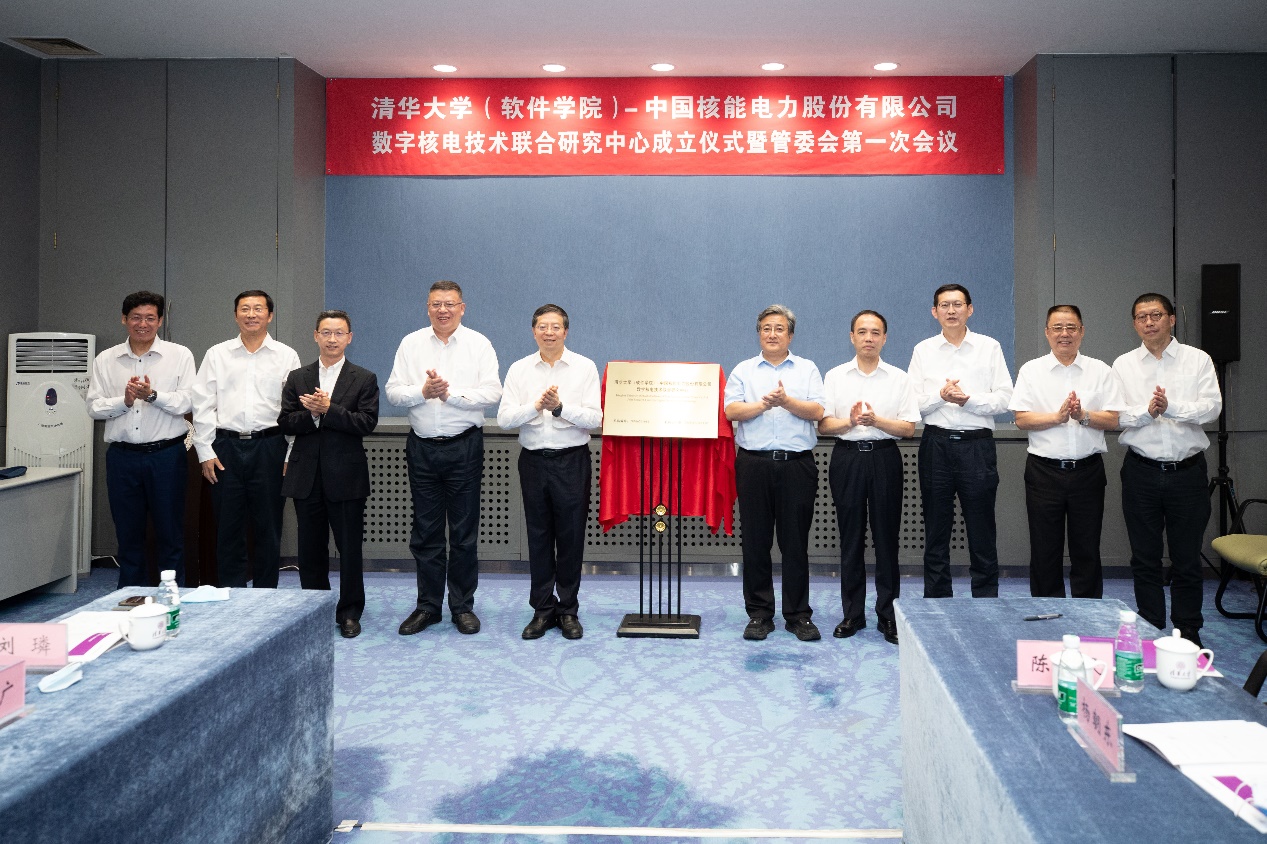 邱勇和余剑锋共同为乐动平台(软件学院)-中国核能电力股份有限公司数字核电技术联合研究中心揭牌。副校长尤政、中国核工业集团有限公司副总经理曹述栋、软件学院院长王建民、中国核能电力股份有限公司董事长刘敬、清华控股有限公司总经理赵燕来、中国核工业集团有限公司科技与信息化部主任钱天林、乐动平台科研院副院长甄树宁、中国核能电力股份有限公司总经理马明泽等嘉宾见证揭牌。